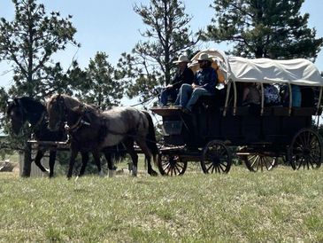 This beautiful covered wagon (that holds 12-14 people) is brought right to the Montana Country Pines park and unloaded and tacked up by the famous Wagon Master, Duncan Vezain.